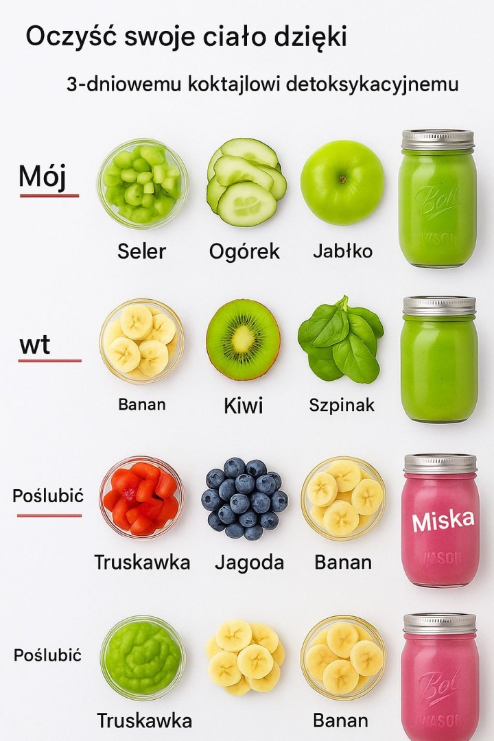 Szukasz prostego i smacznego sposobu na lekki detox i wsparcie spalania tłuszczu? Ten 3-dniowy plan koktajli oparty na świeżych owocach i warzywach pomoże Ci poczuć się lekko i zdrowo. Każdego dnia przygotuj jeden z trzech koktajli – wystarczy blender i kilka składników.
