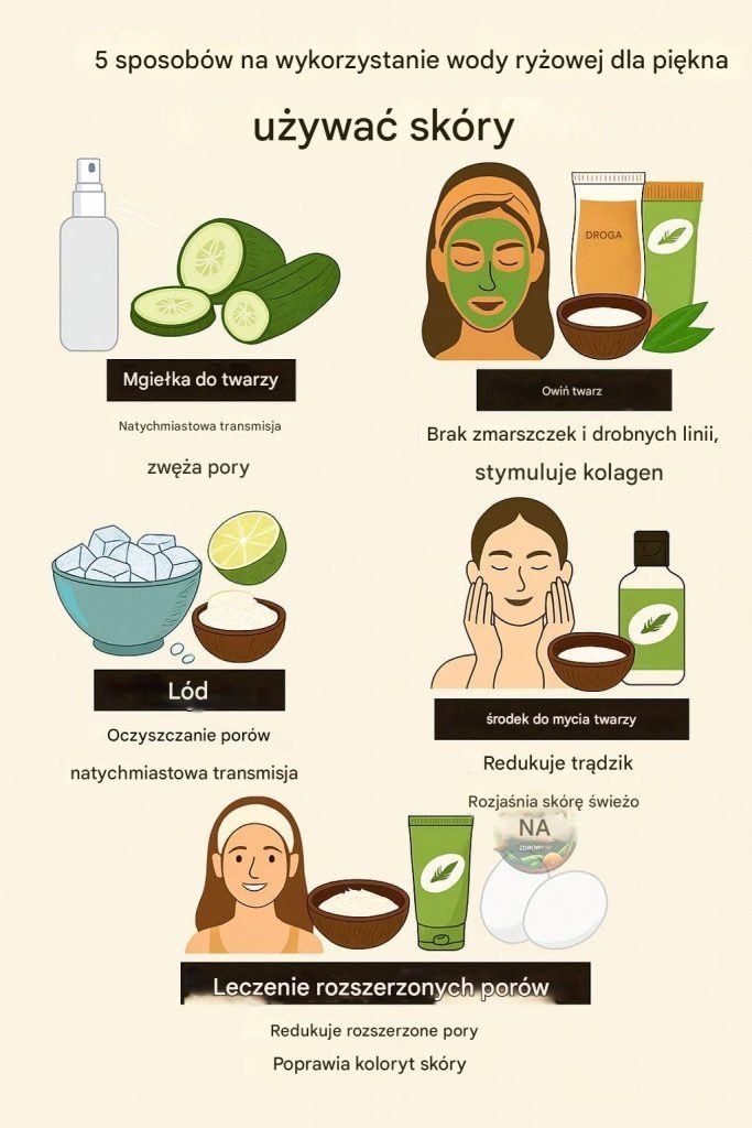 Dokładnie opłucz ryż i namocz go w wodzie przez 30 minut (lub gotuj przez 10 minut). Przefiltruj wodę, pozwól jej ostygnąć i wlej ją do czystej butelki ze spryskiwaczem. W razie potrzeby dodaj ogórek lub sok z cytryny. Przechowuj w lodówce do 5–7 dni.