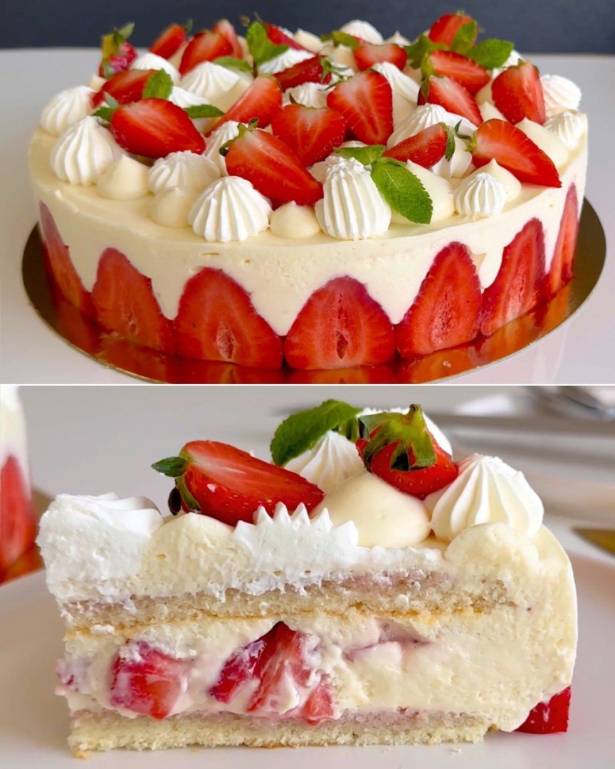 Wystudzone ciasto przekrój na dwie części. Na pierwszą warstwę nałóż połowę kremu truskawkowego, równomiernie rozsmarowując. Przykryj drugą warstwą ciasta, a na wierzch wyłóż resztę kremu. Na koniec udekoruj świeżymi truskawkami i bitą śmietaną, jeśli chcesz.