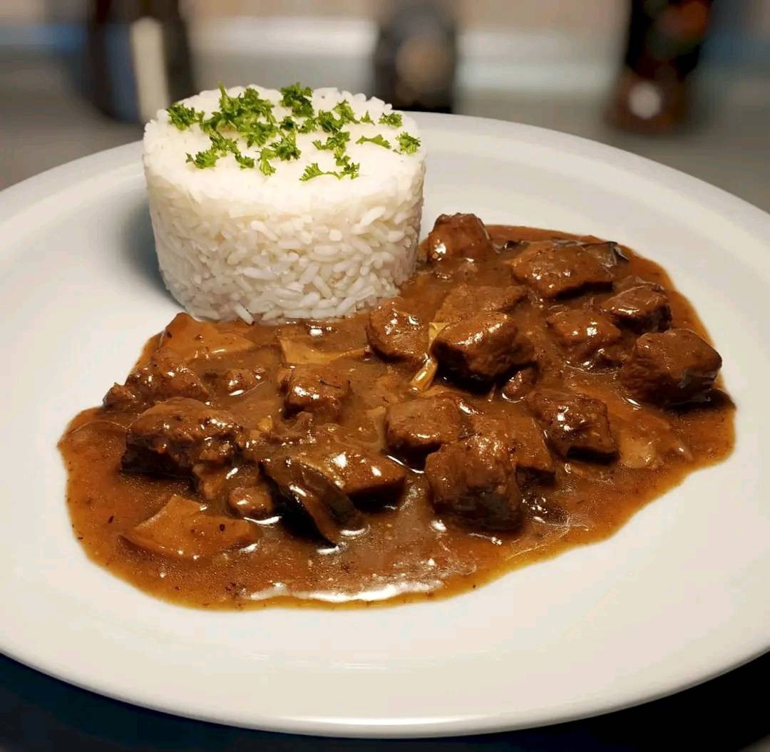 Kostki wołowe z sosem grzybowym i ryżem. Życzę wszystkim miłego i relaksującego poranka
