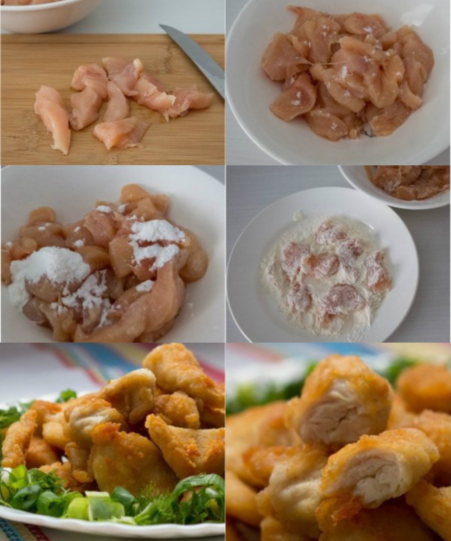 🧂 Główne składniki: pierś z kurczaka, skrobia kukurydziana, soda oczyszczona, sok z cytryny, sól, mąka i olej roślinny do smażenia.