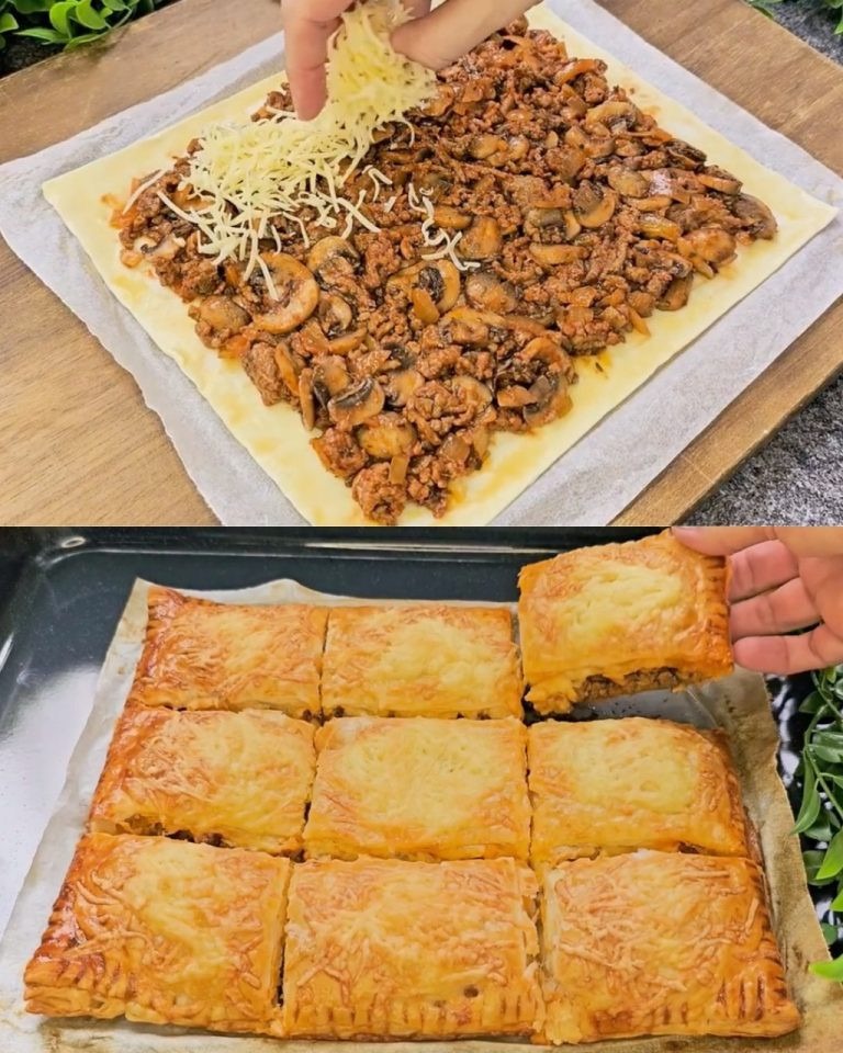 Składniki: 1 arkusz ciasta francuskiego 200 g mięsa mielonego 200 g pieczarek 1 łyżka oliwy z oliwek 1 cebula 2 ząbki czosnku 2 łyżki koncentratu pomidorowego 1/2 łyżeczki soli 1 szczypta pieprzu 1 łyżeczka przypraw 1 łyżeczka suszonego oregano 1 jajko Wskazówki: