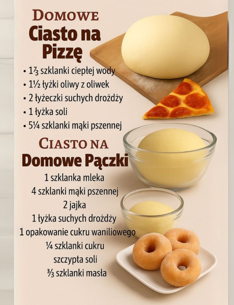 Dziś miksujemy dwa ciasta – jedno na chrupiącą pizzę 🍕, drugie na puszyste pączki 🍩. 1) Domowe ciasto na pizzę 🍕 Składniki (na 2 średnie pizze): 1⅓ szklanki ciepłej wody (ok. 320 ml) 💧 1½ łyżki oliwy z oliwek 2 łyżeczki suchych drożdży (ok. 7 g) 1 łyżka soli 5¼ szklanki mąki pszennej (ok. 650 … Read more