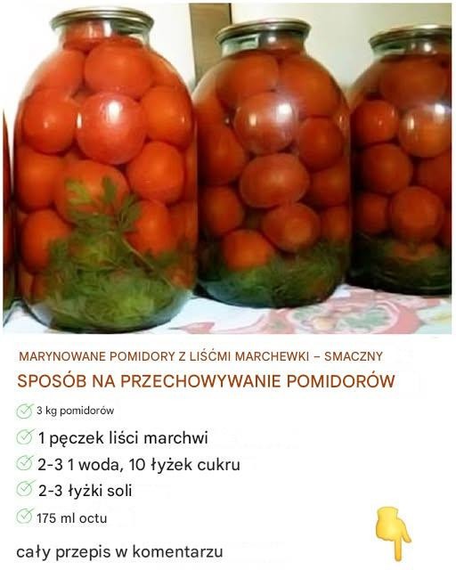 Pomidory marynowane w liściach marchwi –Najsmaczniejszy sposób na konserwowanie pomidorów Pomidory marynowane w liściach marchwi –3 kg pomidorów 1 pęczek liści marchwi 2-3 l wody 10 łyżek cukru 2-3 łyżki soli 175 ml octu Sposób przygotowania: Następny→
