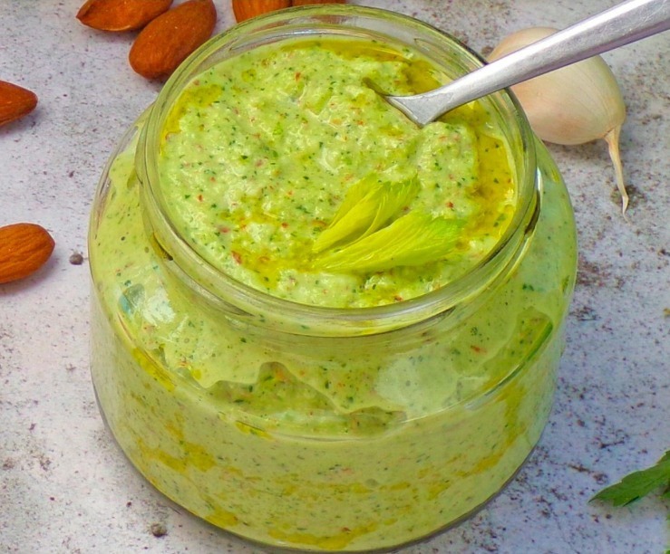Pesto z selera  to prosta i pyszna  przyprawa, której  przygotowanie zajmuje zaledwie 5 minut. Delikatny i kremowy  sos  na bazie selera (łodygi i liście), migdałów, tartego parmezanu, czosnku, oliwy i świeżej bazylii, doskonały do ​​uszlachetniania letnich makaronów i risotto lub do smarowania kanapek i tostowych kromek chleba, podawany w godz.  aperitif  . Odmiana klasycznego przepisu liguryjskiego, wszystkie składniki miksujemy w misie blendera ze szczyptą soli i pieprzu, aż do uzyskania mieszanki o gładkiej i aksamitnej konsystencji.