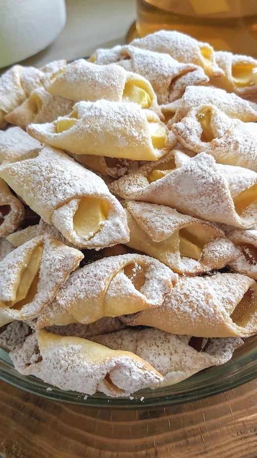 Ciasto rozwałkować,wykrawać kwadraty,kłaść na środek po niedużym plasterku gruszki,brzoskwini lub obranego jabłka.Zlepić 2 przeciwne rogi.