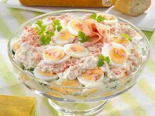 SAŁATKA JAJECZNA WARSTWOWASkładniki:10 jajek (rozmiar M)500g śmietany sałatkowejJogurt o obniżonej zawartości tłuszczu 40%500g śmietanyPieprz biały solony1 Bund Petersilie2. Bund Kerbela200 g pokrojonej w plastry gotowanej szynkiBardzo cienki plaster szynkiPrzygotowanie: Następny→