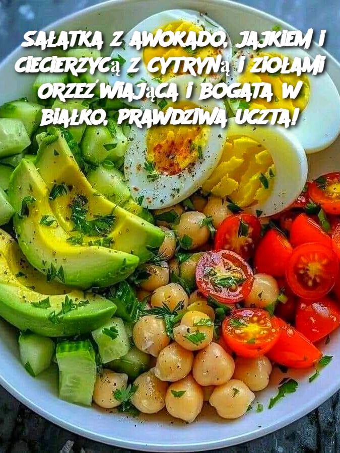 Rozkoszuj się wyjątkowym smakiem tej sałatki z awokado, jajkiem i ciecierzycą, doprawionej cytryną i świeżymi ziołami! Doskonała propozycja na pożywny lunch lub lekką kolację, pełna zdrowych tłuszczów, białka i świeżych ziół.