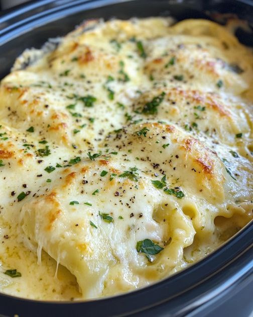Lasagne z kurczakiem i sosem Alfredo w wolnowarze z pesto